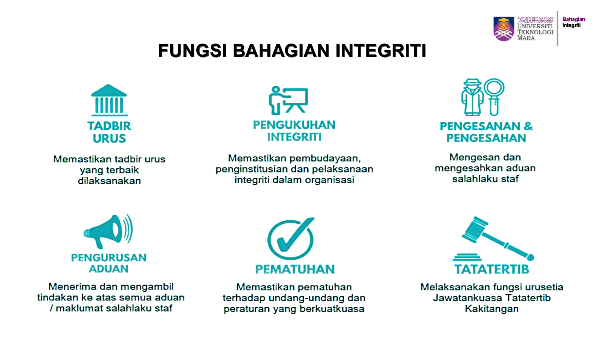 Administrator Bahagian Integriti Fungsi Bahagian Integriti Print Enam (6) fungsi teras Bahagian Integriti dijalankan mengikut matlamat penubuhannya iaitu :